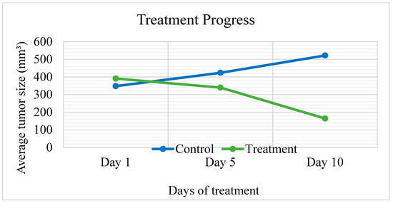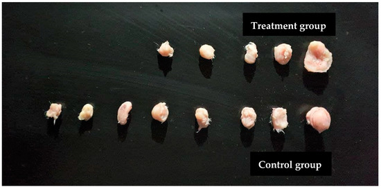Ethyl acetate extract, which exhibited the best results in in vitro experiments, was selected for in vivo study. A significant reduction in tumor size (p = 0.003) was observed in the treatment group compared to the negative control, where tumor growth was increased by (49.94%). The treatment group caused a high percentage in tumor size reduction (57.97%) and the undetected tumors (44.44%) with no recorded deaths (Table 8 and Figure 5). Comparison of tumor sizes after dissection at day 10 in all groups (n = 9) are shown in Figure 6.