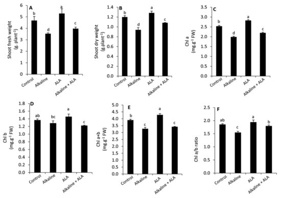 Effect of exogenous α-lipoic acid (ALA; 20 µM) on shoot fresh weight (A), shoot dry weight (B), Chl a (C), Chl b (D), Chl a + b (E) and Chl a/b ratio (F) of wheat seedlings grown under sodic alkaline stress. Chl, chlorophyll.