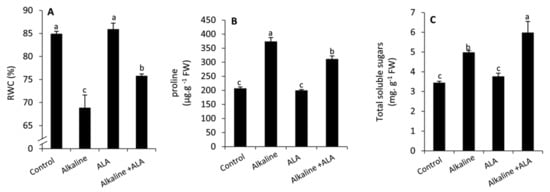Sodic alkaline stress significantly (p ≤ 0.05) reduced RWC compared to the unstressed conditions (Figure 2). An opposite and significant (p ≤ 0.05) trend was observed with respect to proline and total soluble sugars. Wheat seedlings treated by ALA significantly (p ≤ 0.05) demonstrated a considerable increase in RWC and total soluble sugars compared to the ALA-untreated seedlings under sodic alkaline stress conditions. However, proline was significantly decreased (p ≤ 0.05) in this respect.