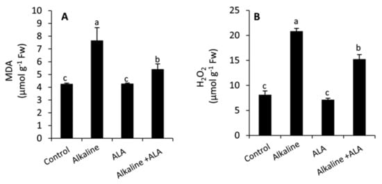 Compared with the control, wheat seedlings exposed to sodic alkaline stress revealed a higher and more significant (p ≤ 0.05) rate of lipid peroxidation and extensive accumulation of reactive oxygen species (ROS) as indicated by the increase in the concentration of malondialdehyde (MDA) and H2O2, respectively (Figure 3). However, applied-ALA significantly (p ≤ 0.05) decreased MDA and H2O2 compared to the ALA-untreated plants.