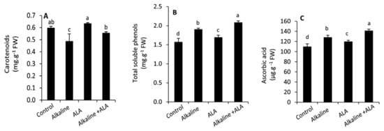 Except for carotenoids, all studied non-enzymatic antioxidants, including carotenoids, total soluble phenols, and ascorbic acid, were significantly (p ≤ 0.05) increased by exposure to sodic alkaline stress (Figure 4). Under sodic alkaline stress conditions, applied-ALA led to improve the carotenoids, total soluble phenols and ascorbic acid. A similar trend was observed under non-stressed conditions.