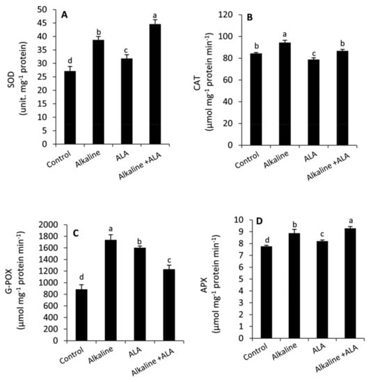 Sodic alkaline stress significantly (p ≤ 0.05) enhanced the activities of antioxidant enzymes (SOD, CAT, G-POX and APX) compared to the unstressed conditions (Figure 5). Wheat seedlings treated by ALA exhibited an obvious improvement in SOD, G-POX and APX, but CAT was decreased under non-sodic alkaline conditions. On the other hand, the general tendency under sodic alkaline conditions was that SOD and APX were improved in ALA-treated seedlings, while the activities of CAT and G-POX were inhibited compared to ALA-untreated seedlings.