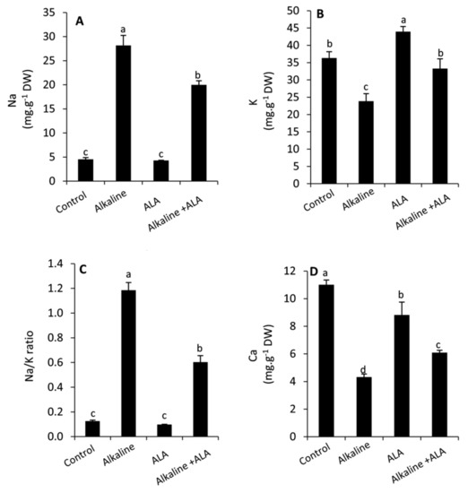On the other hand, wheat seedlings exposed to sodic alkaline stress demonstrated a higher accumulation of Na with a serious decrease in K and Ca, leading to a considerable increase in the Na/K ratio (Figure 6A–D). This disturbance in the ionic homeostasis, in particular with elevating the concentration of Na, can be toxic to the cytosolic enzymes [70]. Moreover, it can affect plant water relations and hinder the uptake of nutrients [28,49,55]. Additionally, the higher values of pH under alkaline stress can impede or prevent the uptake of essential nutrients [17]. In this study, we noticed that exogenous ALA achieved an improvement in the leaf water status as indicated by increased RWC and osmolytes (Figure 2A–C). Furthermore, ALA reduced the oxidative damage in leaf tissues by enhancing the antioxidative capacity of plants (Figure 4 and Figure 5). These effects can positively affect the selective permeability of the cell membranes and consequently the uptake of water and the essential nutrients such as K and Ca with the transpiration stream. In this context, similar results have been observed on different plant species [21,26,28,54].