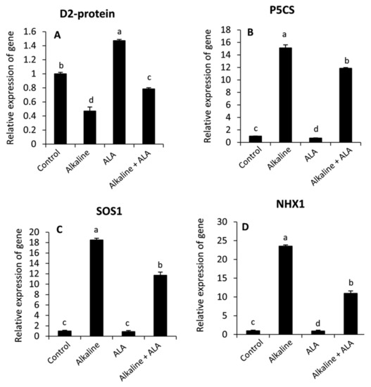 To understand the protective role of ALA in the improvement of plant tolerance to sodic alkaline stress, the relative gene expression of D2-protein, P5CS, SOS1 and NHX1 was studied by RT-qPCR (Figure 7). It can be observed that sodic alkaline stress significantly (p ≤ 0.05) down-regulated the relative expression of D2-protein, while P5CS, SOS1 and NHX1 were up-regulated. Interestingly, wheat seedlings of ALA treatment showed significant up-regulation of D2-protein in both non-stressed and sodic alkaline stressed seedlings. Meanwhile, this response was in parallel with a significant down-regulation of P5CS, SOS1 and NHX1 under sodic alkaline stress conditions.