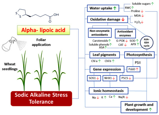 A summary for the induction of sodic alkaline stress tolerance in wheat seedlings by exogenous application of α-lipoic acid. Arrows up and down refer to upregulation and downregulation of various studied aspects respectively.