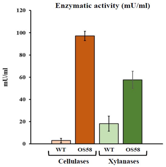 The enzymatic activity of cellulases (in orange) and xylanases (in green) in the WT and OS58 strains (as indicated on the x-axis). Cells were grown in a chemically defined medium for 24 h and assayed with a commercial kit. Enzymatic activity (in mU/mL of spent medium) is reported on the y-axis. Values represent the average of at least five independent experiments. Error bars represent the standard error of the mean (SEM).