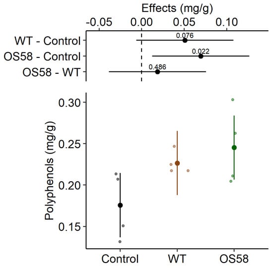 The total polyphenols content (calculated as mg per gram of fresh cauliflowers, before freezing) is reported for Control, WT, and OS58 groups as estimated means and 95% confidence intervals (larger dots and colored lines, respectively) by the linear mixed model (LMM). On the upper side of the plot, treatment effects are reported in mg/g as the estimated means and 95% confidence intervals for each comparison, as difference from the control or between enzymatic treatments, as indicated on the left (degrees of freedom-df = 10.7). The level of significance (p-value) is reported above each horizontal line; the dashed line corresponds to the “no effect” hypothesis. The values reported were obtained from the model using the emmeans package (n = 4, for each group) [].