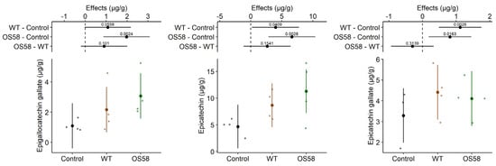 The catechins content (calculated as μg per gram of fresh cauliflowers) is reported for the Control, WT, and OS58 groups. A detailed description of these types of plots is provided in Figure 2.