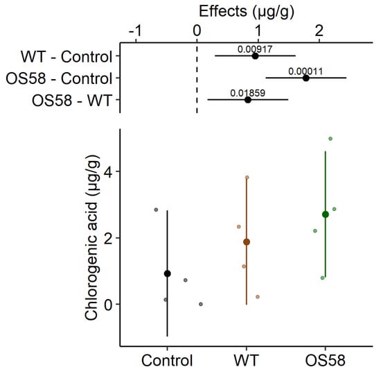The chlorogenic acid content (calculated as μg per gram of fresh cauliflowers) is reported for the Control, WT, and OS58 groups. A detailed description of these types of plots is provided in Figure 2.