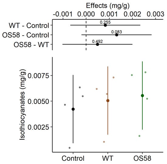The isothiocyanates content (calculated as mg per gram of fresh cauliflowers) is reported for the Control, WT, and OS58 groups. A detailed description of these types of plots is provided in Figure 2.