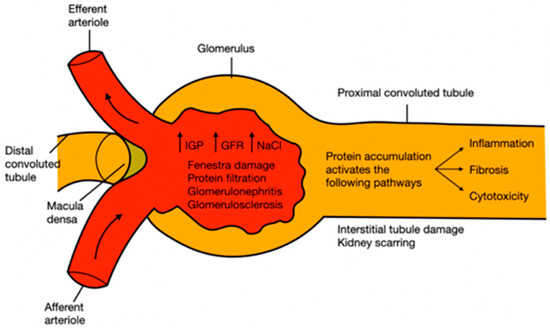 Hypertension is a disease characterized by permanent or continuous high pressure; according to international guidelines on hypertension, systolic blood pressure values must be higher than 140 mmHg and diastolic blood pressure higher than 90 mmHg. However, pharmacological treatments depend on the patient’s age and comorbidities [84,85,86,87]. The kidney has self-regulating mechanisms to dampen fluctuations in systemic blood pressure to avoid an increase in intraglomerular pressure. However, at constant high blood pressure, these kidney mechanisms fail because the incoming vessels become weaker, stiffer, or thinner, and a phenomenon called myogenic reflex occurs. During the first compensatory response, the depolarization of the membrane, by increasing the intracellular calcium flux through the L-type channels, causes a change in caliber (contraction) in the afferent arteriole. When this first mechanism fails, there is an increase in intraglomerular filtration and pressure, also associated with an increase in the sodium chloride load. To compensate, another autoregulatory mechanism called tubuloglomerular feedback switches on, which is detected in the distal tubule by the macula densa cells. The failure in compensatory self-regulatory mechanisms ended in glomerulonephritis, the development of glomerulosclerosis, and a rupture of the fenestra, leading to the filtration of larger molecules such as proteins, which leads to proteinuria. As proteins accumulate in the tubules, they activate profibrotic, proinflammatory, and cytotoxic pathways, causing tubulointerstitial damage and kidney scarring (Figure 3) [88,89,90].