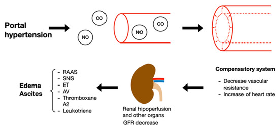 Liver disease has 4 different stages; stages 1 and 2 belong to the compensatory phase characterized by being asymptomatic, whereas stages 3 and 4 belong to the decompensatory phase, characterized by ascites, variceal bleeding, hepatic encephalopathy, ending in the last stage in sepsis and kidney failure. Cirrhosis is representative of the last stage of chronic liver disease, commonly called cirrhosis, characterized by regenerative nodules, progressive fibrosis, and chronic inflammatory response, leading to hypertension. Multiple mechanisms that cause acute kidney damage, secondarily to cirrhosis, have been observed. An alteration in the liver circulatory system as a consequence of chronic inflammation and hypertension results in an excessive release of vasodilators such as carbon monoxide (CO) and nitric oxide (NO). The foregoing decreases vascular resistance causing heart failure, which is initially compensated by an increase in heart rate. As the disease progresses, GFR decreases, leading to the activation of endogenous vasoconstrictor systems such as the sympathetic nervous system (SNS), endothelin (ET), arginine vasopressin (AT), RAAS, thromboxane A2 and leukotrienes, which in turn causes edema and ascites (Figure 4). Secondary to the above, there is an increase in intestinal permeability, causing bacterial translocation, systemic inflammation, and oxidative stress [91,93].