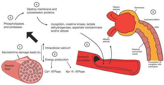 The rhabdomyolysis subsequently causes kidney damage through the activation of platelets and the heme group (product of muscle necrosis); this group interacts with macrophage antigen 1 (Mac-1) and promotes citrullination of histones, ROS production, and subsequent macrophage extracellular trap (MET) formation. Kidney damage occurs through damage to cells of the proximal convoluted tubule due to the accumulation of ROS, lipid peroxidation, and precipitation of myoglobin with uromodulin (Figure 5) [100,103].