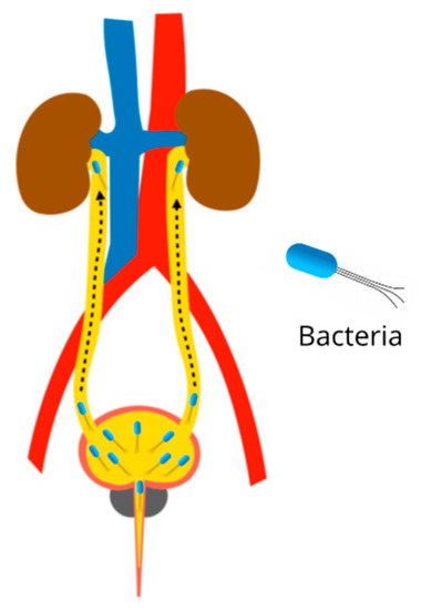 Urinary tract infections (UTI) are common ailments, mainly caused by bacteria such as Escherichia coli, Klebsiella pneumoniae, Proteus mirabilis, Enterococcus faecalis, Staphylococcus saprophyticus, Proteus spp., Streptococcus agalactiae, and Pseudomonas aeruginosa. When the pathogens are positioned in the bladder and prostate, they cause cystitis and prostatitis respectively, being classified as lower UTIs. When the uropathogens reach the kidney, they are classified as upper UTIs. Renal damage caused by UTI is characterized by severe inflammation in the interstitial tubule and subsequent fibrosis, which is called pyelonephritis (Figure 6). During fibrosis, kidney scars are created; due to this non-functional tissue, they cause a decrease in kidney activity, which eventually leads to the development of chronic kidney disease [105,106,107].