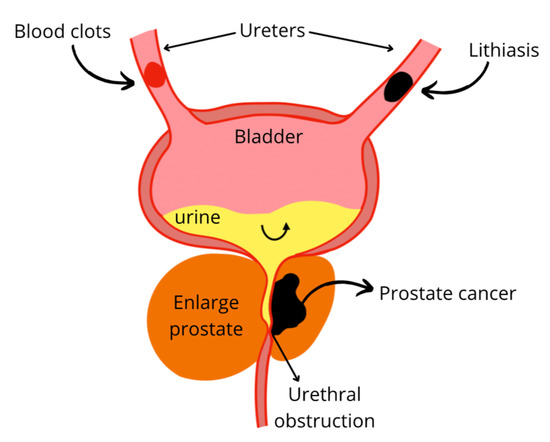 Urinary flow obstruction due to lithiasis, blood clots, or prostate enlargement.