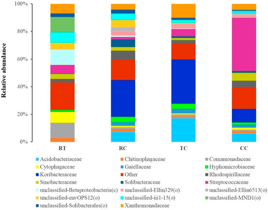 Taxonomy analysis showed that there were 15 main soil bacterial orders in four planting soils (Figure 1A), and the relative abundance of order Acidobacteriales significantly differed among the four samples as TC > RC > CC > RT. The relative abundance of order Solibacterales was significantly higher in RC (p < 0.05). The relative abundance of order Lactobacillales was significantly higher in CC (p < 0.05).