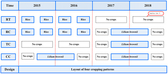 Four treatments were performed in a field previously cultivated with rice (Oryza sativa). Experiments included a control with no O. sativa and L. brownii cultivation during the whole experimental period (RT), L. brownie-O. sativa-L. brownii rotation plots (RC), newly planted plots (TC), two-year consecutively monocultured plots (CC) (Figure 3). To ensure similar environmental conditions, all four treatments had three repetitions, and the planting area of each repetition was 0.05 hm2. Moreover, all treatments were closely adjacent to each other and kept under the same field management during the entire experimental period.