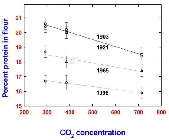 Yet, at present there is limited evidence for a simple dilution hypothesis. For example, a study of spring wheat lines from the early to late 20th century did indicate that newer lines had less protein in flour; however, each cultivar also showed a decline in protein with increasing [CO2] from the early 20th century (Figure 1). As spring wheat does not outcross per se, this suggests that [CO2] is directly affecting protein concentration separate from breeding history [].