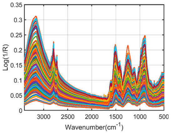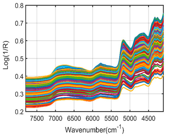 The spectral acquisition of Arabidopsis powder samples was performed by adopting a laboratory-based Antaris II FT-NIR analyzer (Thermo Scientific Co., Waltham, MA, USA). The system incorporated an InGas detector which could perform spectral data collection within a wavelength range of 4000–10,000 cm−1. The powder samples were deposited on the sample holder and covered with a black lid to avoid fluctuations from the background environment. The spectrometer was operated in reflectance mode, which collected the spectrum for each sample by performing 32 scans at 4 cm−1 spectral intervals. The average spectrum was used for the spectral analysis, which was saved in Excel format.