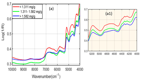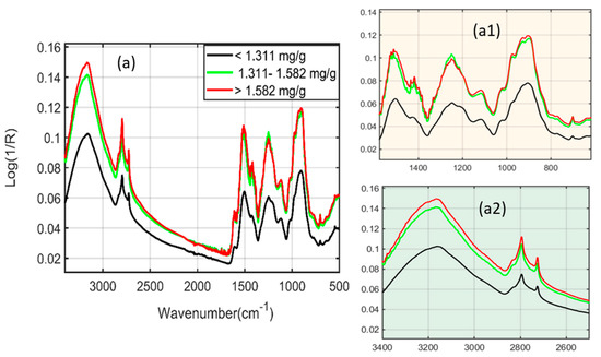 The multiplicative scattering correction (MSC) preprocessed spectra shown in Figure 4a exhibit significant spectral peaks for all six different phenolic concentrations ranging from <1.311 mg/g to 1.311–1.582 mg/g and >1.582 mg/g, which were identified through the HPLC method. Various important characteristic peaks for the phenolic compounds were observed in the preprocessed spectra in Figure 4a and the extended regions (a1) around 8350 cm−1, 6000–7000 cm−1, and 5500–6000 cm−1, which are associated with the second overtone of C-H stretching, the first overtone of the O-H and N-H stretching [22], and the first overtone of C-H stretching vibrations [23], respectively.