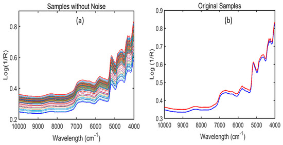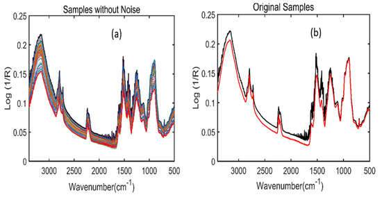 During FT-IR and FT-NIR spectral acquisition, only ninety sample spectra were acquired for each of the six different phenolic concentrations under various stress conditions (LED lights + water), which is not enough to develop a strong multivariate analysis model. Due to presence of a fewer number of samples, the phenomena of underfitting occurs. In order to solve this problem, an algorithm introduced by Dirichlet was utilized in this study to avoid the underfitting issue. The detailed mathematical explanation of this algorithm is presented elsewhere [24]. The Dirichlet distribution algorithm generated 600 synthetic data for each spectroscopic technique which were later used for model development. The working procedure of this algorithm has been symbolized through Figure 5 and Figure 6. Here, the term sample without the noise in Figure 5 and Figure 6 represents the preprocessed spectra after the generation of synthetic spectral data, while the original data term in Figure 5 and Figure 6b represent the original spectra of RD_1 and RD_20 and WD_1 and WD_10 respectively.