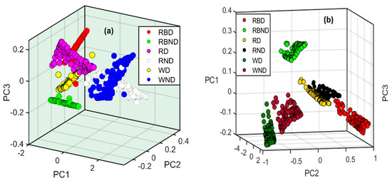 Principal component analysis is a widely used unsupervised method for visualizing data by performing dimension reductions in machine learning. First, PCA was applied to the preprocessed data of the Arabidopsis thaliana powder samples to check its ability to differentiate the samples under different stress conditions. Figure 7a presents the resultant 3D scatter plot for the FT-IR spectroscopic data, showing clustering among the samples depending upon the changes in phenolic concentration. The first three principal components (PCs), i.e., PC1, PC2, and PC3, accounts for highest present in the spectral data, which are nearly 95%. In contrast, the remaining PCs did not show significant changes in the variance, and mainly presented noise in the data. For the FT-IR spectroscopic data, the PCA model was not capable of differentiating between the samples under six different stress conditions and resulted in the overlapping of spectral data due to the reduced sensitivity of the FT-IR towards the Arabidopsis powder samples. The 3D PCA scatter plot for the FT-NIR spectra is shown in Figure 7b, showing clear sample discrimination under different stress conditions. The first three PCs exhibit maximum variance in the sample data, whereas the remaining PCs are less informative. The developed PCA model completely isolated all six conditions, whereas RD and RND data slightly overlapped due to less difference between the phenolic concentrations under these conditions. Thus, it is suggested that PCA provides more vital support to FT-NIR spectroscopy data than FT-IR for the clear visualization and further discrimination of plant powder samples under various stress conditions.