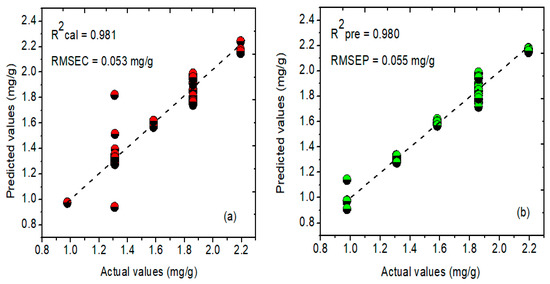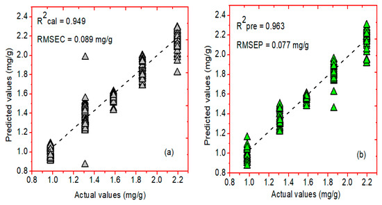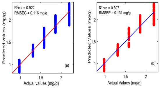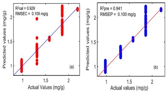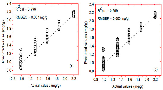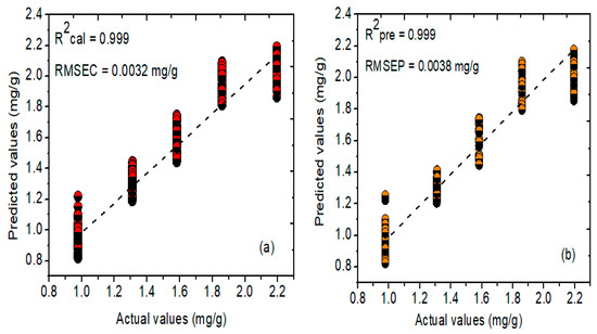 For the FT-NIR spectral data, first, the PLSR models were constructed using different preprocessing methods. In comparison with other preprocessing methods, i.e., normalization, MSC, SNV, and Savitzky–Golay derivatives (first and second), MSC performed slightly better and acquired higher calibration and prediction correlation coefficient (R2) values of 0.999 with minimum error values (RMSE) of 0.003 mg/g, respectively. Figure 11a,b depicts the actual and predicted values derived through the PLSR model, which clearly shows a good relationship between the two groups.