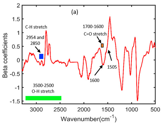The results acquired through the PLSR model resulted in better performance for both the spectroscopic techniques; therefore, the beta coefficients were plotted to illustrate significant wavenumbers, which are crucial for providing information regarding phenolic compounds’ chemical structures. The FT-IR spectroscopy beta plot is presented in Figure 14a, which shows essential spectral signatures under a suitable wavelength range. The spectral regions from 3500 to 2500 cm−1 and 1700 to 1600 cm−1 addressed the O-H and C=O stretching vibrations of phenolic compounds, respectively. Additionally, a few peaks were observed around 1600, 1505, and 1500 cm−1, identical to those observed in Figure 2a, indicating the sensitive regions of phenolic compounds identified through FT-IR spectroscopy.