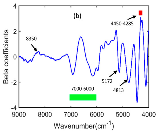 Beta coefficient plots developed through the PLSR model: (a) FT−IR spectroscopy and (b) FT−NIR spectroscopy.
