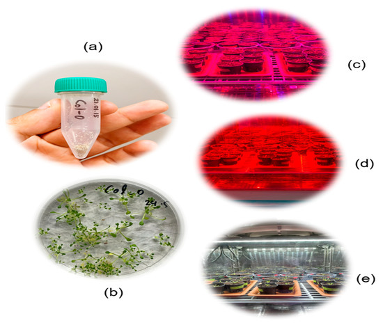 In this study, Arabidopsis thaliana plant samples were used. For the germination of Arabidopsis seeds, the Arabidopsis thaliana “Col-10” seeds shown in Figure 15a were grown on a Petri dish in the presence of a suitable medium (Figure 15b) at 4 °C for 7 days. After the germination was finished, the seedlings were plucked from the Petri dish and carefully moved into the soil pots, ensuring that they did not break. Before the seedlings were replanted in the pots, the soil was autoclaved at 125 °C for 20 min to remove unwanted species such as fungi or germs from the soil. The pots were later relocated to inside a growth chamber under three different LED lighting conditions, such as red+ blue light, red light, and white light, as shown in Figure 15c–e, for 8 h. The plants were grown inside the room at a 25 °C temperature and 70% humidity, conditions which were kept constant throughout the experiment. Drought stress was induced on the plants after two weeks, where 5 mL of water was poured into half of the plants inside the chamber for each lighting condition.