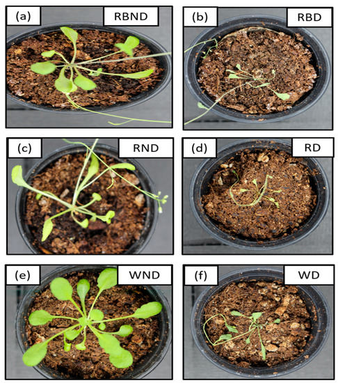 RGB images of non-drought and drought conditions of A. thaliana plants under different LED lightning conditions. Here, RBND and RBD (a,b) represents red + blue non-drought and red + blue drought, RND and RD (c,d) represents red non-drought and red drought, and WND and WD (e,f) represents white non-drought and white drought respectively.