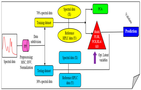 After the generation of the artificially mixed 600 samples using the Dirichlet algorithm, the regression analysis models were constructed by creating calibration and prediction datasets. For the calibration dataset, 360 samples (60 samples from each condition) were used out of 600 samples. In comparison, the remaining samples for the prediction dataset consisted of 240 samples (40 samples from each condition) shown in Table 4. Three different regression analysis methods, namely, PLSR, PCR, and HLA/GO, were employed for the non-destructive estimation of phenolic compounds in the scanned powdered samples.