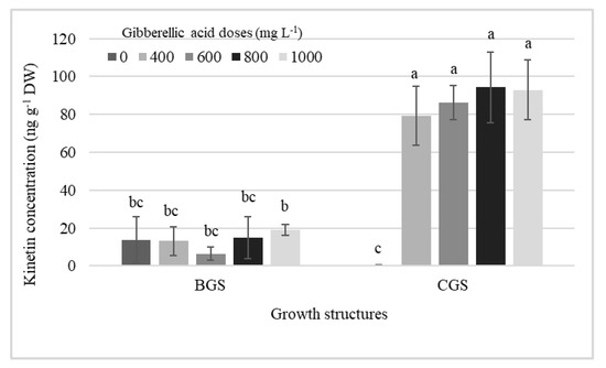GA3 exogenous doses and its interaction with the growth structures increased the endogenous KIN concentration in I-PSB CGS, which was higher (99%) than when GA3 was not used, and 86% higher than the average of all KIN concentrations in BGS (Figure 1).