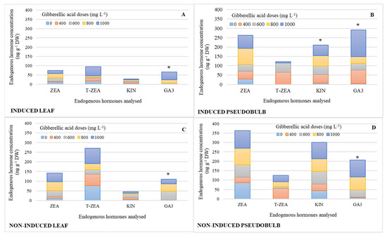 Endogenous hormone concentration of zeatin (ZEA), trans-zeatin (T-ZEA), kinetin (KIN), and gibberellic acid (GA3), in leaf and pseudobulb of Laelia anceps subsp. anceps plants, induced (A,B) and non-induced (C,D) to flowering by different doses of exogenous gibberellic acid (GA3; mg L−1) (The bars with asterisks show the endogenous hormone with significant differences, which are shown in Table 2; n = 3).
