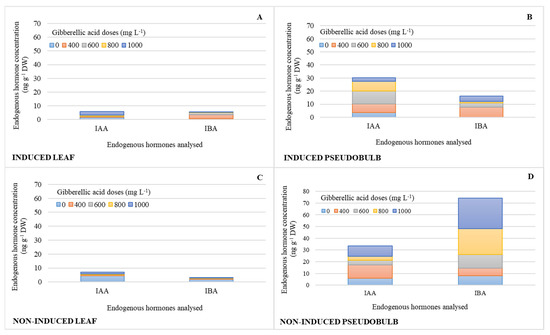 The concentrations of auxins (IAA, IBA) were similar in I-Leaf and NI-Leaf. Regardless of whether they were induced to flower, IAA and IBA increased their pseudobulb concentration by 73 and 90%, respectively (Figure 3B,D), compared to the leaf concentration (Figure 3A,C). It is also observed that the action of the 800 and 1000 mg L−1 doses increases the IBA concentrations in NI-PSB by 67 and 83%, respectively, compared to the other doses, and 72% more (Figure 3D) than I-PSB (Figure 3B), while ABA levels were in the range of 0.08 for leaf and 0.2 ng g−1 DW for pseudobulb.