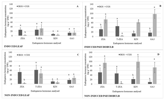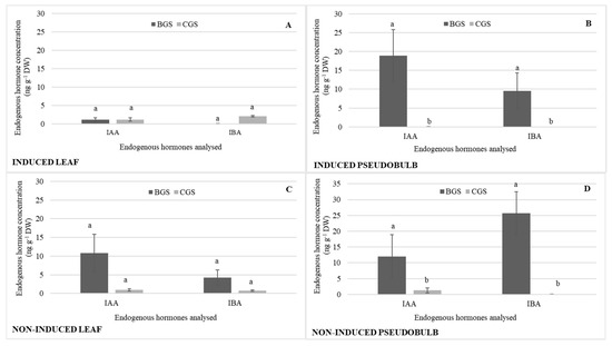 Endogenous hormone concentration of indole acetic acid (IAA) and indole-3-butyric acid (IBA) in the back and current growth structure (BGS, CGS) of leaf and pseudobulb, induced (A,B) and non-induced (C,D) to flowering in Laelia anceps subsp. anceps plants, by different doses of exogenous gibberellic acid (GA3). Bars with different letters + SD indicate significant statistical differences (Tukey, p ≤ 0.05; n = 3).