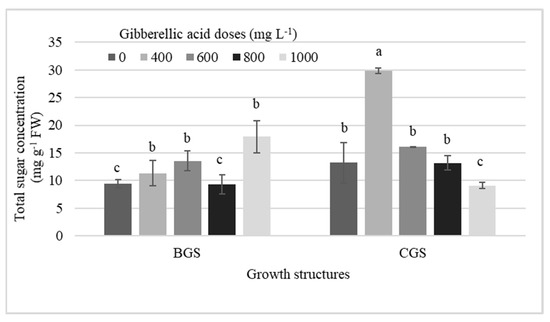 Interaction effects among different doses of exogenous gibberellic acid (GA3), and the back and current growth structure (BGS, CGS) on the concentration of total sugars in pseudobulbs of Laelia anceps subsp. anceps plants non-induced to flowering. Bars with different letters + SD indicate significant statistical differences (Tukey, p ≤ 0.05; n = 3).