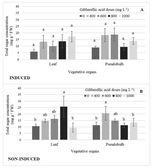 Concentration of total sugars in leaf and pseudobulb, (A) in induced and (B) non-induced plants of Laelia anceps subsp. anceps by different doses of exogenous gibberellic acid (GA3). Bars with different letters + SD indicate significant statistical differences (Tukey, p ≤ 0.05; n = 3). FW = fresh weight.