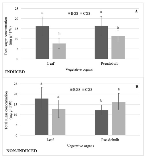 Concentration of total sugars in leaf and pseudobulb of back and current growth structure (BGS, CGS) of Laelia anceps subsp. anceps plants, (A) induced and (B) non-induced to flowering. Bars with different letters + SD indicate significant statistical differences (Tukey, p ≤ 0.05; n = 3).