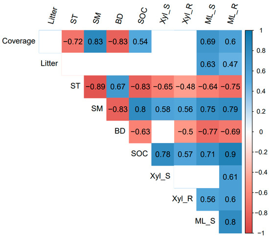 Heatmap of Pearson correlation between 10 variables. Litter: litter biomass; ST: Soil temperature; SM: Soil moisture; BD: bulk density; SOC: soil organic carbon; Xyl_S: β-xylosidase of shoot; Xyl_R: β-xylosidase of root; ML_S: mass loss of shoot; ML_R: mass loss of root. HG: high altitude + grazing; HM: high altitude + mowing; LG: low altitude + grazing; LM: low altitude + mowing. p-value set at 0.05 for significance.