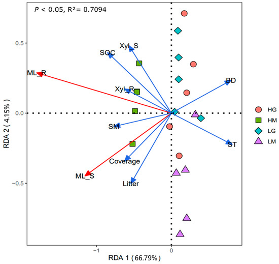 Redundancy analysis graph of the relationships between the plant and soil properties and mass loss of shoot and root (p < 0.05). Litter: litter biomass; ST: Soil temperature; SM: Soil moisture; BD: bulk density; SOC: soil organic carbon; Xyl_L: β-xylosidase of shoot; Xyl_R: β-xylosidase of root. HG: high altitude + grazing; HM: high altitude + mowing; LG: low altitude + grazing; LM: low altitude + mowing.
