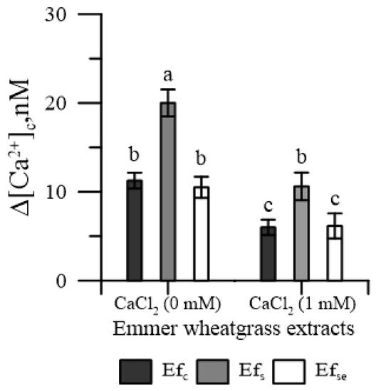 Effects of 50 mg of free extracts (Ef) of emmer wheatgrass obtained with distilled water as a control (Efc), or with NaCl (Efs) 50 mM or Na2SeO3 0.45 mg L−1 (EfSe), on the cytosolic Ca2+ of maize pollen. The measurements were carried out in the absence of Ca2+ and in the presence of Ca2+ (1 mM CaCl2) in the incubation medium. Data are expressed as means ± SEM from four independent tests. Different letters indicate significant differences for p < 0.05.