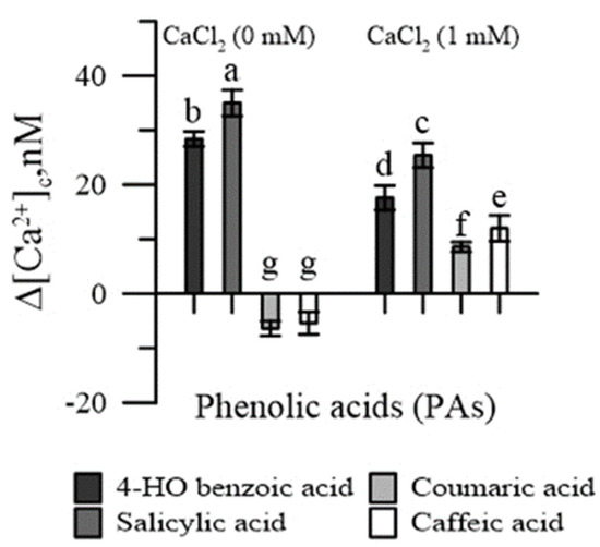 In the absence of CaCl2 in the incubation medium, salicylic and 4-HO benzoic acids increased [Ca2+]cp, while coumaric and caffeic acids reduced it (Figure 2). With the addition of CaCl2 in the incubation medium, an increase in [Ca2+]cp was observed with all PAs, although it was slighter for p-coumaric and caffeic acids.