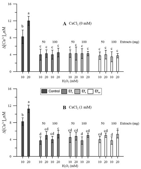 Since the bound extracts had not affected the [Ca2+]cp, only free extracts (Ef) were tested for their effect against oxidative conditions. All three types of free extracts antagonized the effects of H2O2 on cytosolic Ca2+. The effect did not substantially change in the absence (Figure 3A) or presence (Figure 3B) of CaCl2 in the incubation medium, although, in the presence of CaCl2, the highest H2O2 caused further and generally non-significant increases in [Ca2+]cp (Figure 3B).