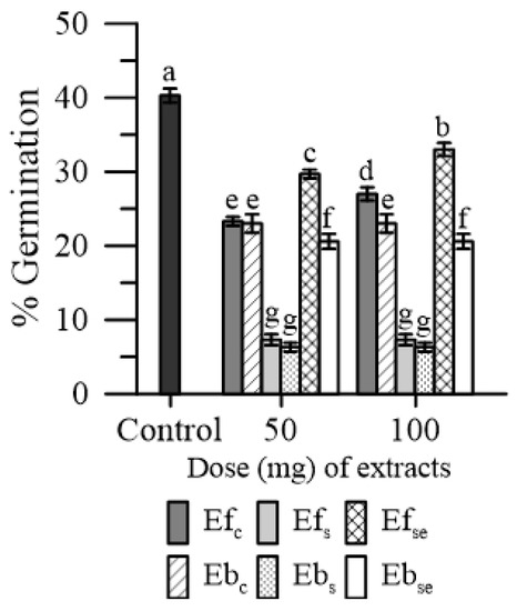 Considering the Ef and Eb groups, the lowest inhibiting effect on pollen germination was caused by EfSe (−25%) and EbSe (−45%). No substantial dose-dependent effect was observed in both Ef and Eb.