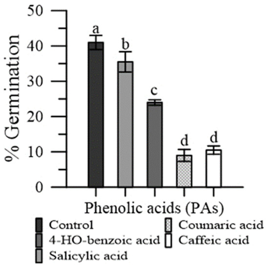 The p-coumaric and caffeic acid severely depressed pollen germination (−81% and −76%, respectively), while the effect was less marked with 4-HO benzoic acid (−32%) and salicylic acid (−15%) (Figure 5).