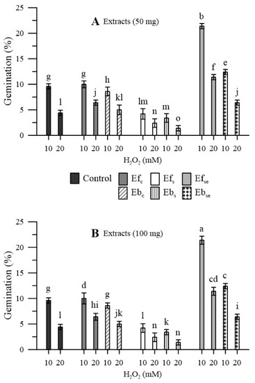 Germination of maize pollen during oxidative stress induced by 10 and 20 mM of H2O2 as affected by pre-treating the pollen with (A) 50 mg or (B) 100 mg of free (Ef) and bound (Eb) extracts of emmer wheatgrass grown with distilled water as a control (Efc, Ebc) or in the presence of salinity as NaCl 50 mM (Efs, Ebs) or selenium as 45 mg L−1 of Na2SeO3 (EfSe, EbSe). Data are expressed as means ± SEM from five independent tests. Different letters indicate significant differences for p < 0.05.