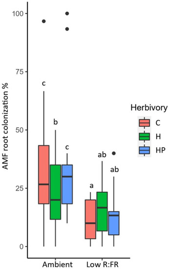 Percentage of tomato roots colonized by AMF under different conditions of light (ambient; low R:FR light) and herbivory. (C = no herbivory; H = herbivory by unparasitized caterpillars; HP = herbivory by parasitized caterpillars). Boxplots that don’t share the same letter are significantly different p < 0.05 (Tukey HSD). The median is represented by the thick horizontal line; the box is defined by the 25th and 75th percentiles (lower and upper quartile).