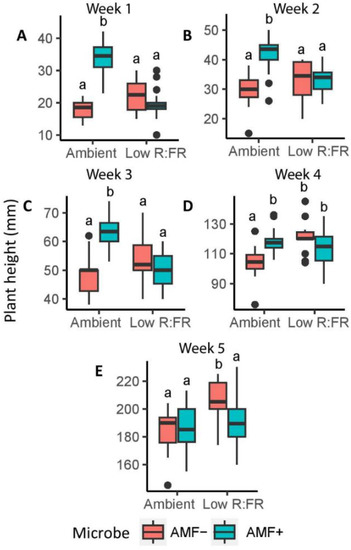 Height of tomato plants during the first five weeks (A–E) after seedling transplantation grown under two light (Ambient and Low R:FR) and two inoculation treatments (AMF−: no mycorrhizae, AMF+: mycorrhiza). Boxplots that don’t share the same letter are significantly different p < 0.05 (Tukey HSD). The median is represented by the thick horizontal line; the box is defined by the 25th and 75th percentiles (lower and upper quartile).