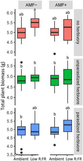 Total dry biomass of tomato plants grown under two light (Ambient, Low R:FR) and two inoculation treatments (AMF−: no mycorrhiza, AMF+: mycorrhiza) and subjected to three herbivory treatments. Boxplots that don’t share the same letter are significantly different p < 0.05 (Tukey HSD). The median is represented by the thick horizontal line; the box is defined by the 25th and 75th percentiles (lower and upper quartile).